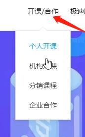 2、在如图所示位置选择开课/合作,这里可以选择个人或机构开课,按照自己的类型进行选择,这里以个人为例。