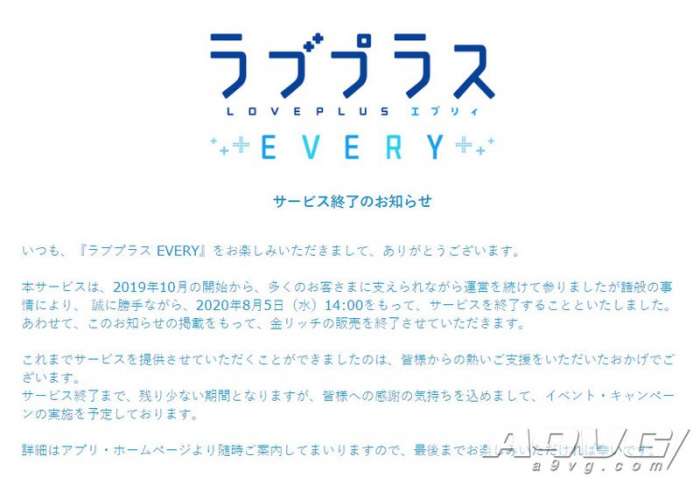 软件提交 专题合集 热门手游KONAMI宣布手机游戏《爱相随EVERY》由于各种原因将于2020年8月5日终止运营。这款游戏最早于2019年10月开服,后由于各种问题陷入长期维护,直到2019年12月11日才正式开始运营,至停服还运营还不到1年时间。
