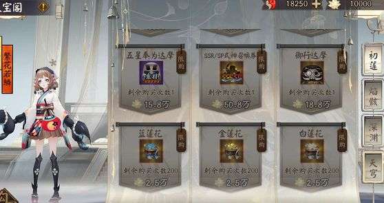 三种箱子(莲花)分别对应为:勾玉体力、SSR/SR碎片、六星御魂,每种箱子都附带达摩碎片和低星结界卡。也是第五天开启兑换。