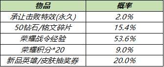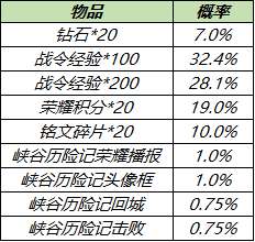 打开可随机获得以下奖励之一:峡谷历险记头像框、峡谷历险记荣耀播报(永久)、峡谷历险记回城(永久)、峡谷历险记击败(永久)、荣耀积分*20、100/200战令经验、钻石*20、铭文碎片*20。