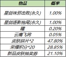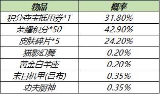 皮肤碎片&积分自选礼盒:打开礼包可任意选择以下奖励之一:荣耀积分*10或皮肤碎片*1