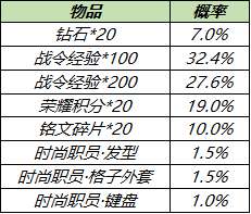 打开可随机获得以下奖励之一:时尚职员·发型、时尚职员·格子外套、时尚职员·键盘、荣耀积分*20、100/200战令经验、钻石*20、铭文碎片*20。
