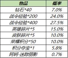 打开可随机获得以下奖励之一:阿轲-迷踪丽影、积分夺宝抵用券*1、英雄碎片*5、皮肤碎片*5、荣耀积分*50、200/400战令经验、钻石*40。