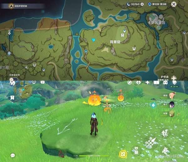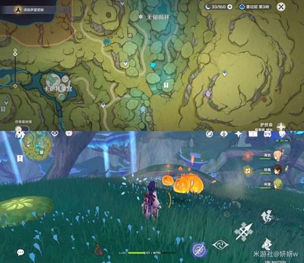 在无郁稠林这一块,同样击败史莱姆,然后用雷元素攻击一下幻影,开启机关点亮箭头。