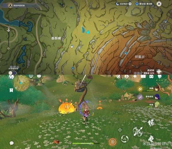 在香醉坡上面,这里有个湖,旁边有个大石块和火史莱姆,击败之后用草元素触发石块,底下会出来幻影,再用雷元素触发就行了