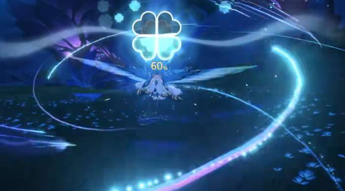 在捕捉之前肯定也是需要先和森彩灵蝶战斗的,大家在打森彩灵蝶时可以看到血条的旁边有3个红色的圆点,这个圆点也代表着不同的阶段,战斗打响以后,玩家需要使用近距离输出型的角色来战斗,战斗的时候,森彩灵蝶会对敌人发起水属性的攻击,第一阶段会用水浪袭击我们,我们只要把正面的水浪给躲避掉就能继续输出,第一阶段不建议大家去捕捉,因为该阶段森彩灵蝶的血量还很高,很容易失败。
