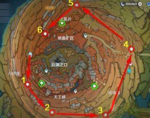 层岩深渊中3个老石在绿圈标记位置磐键旁边,其余6个按照如图所示的顺序即可收集获取。