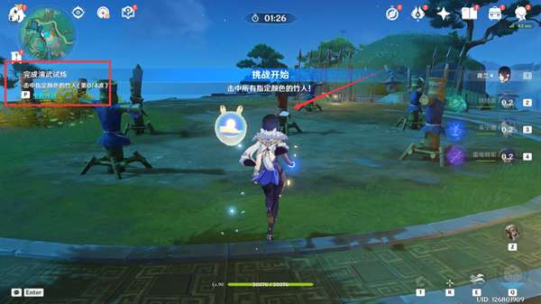 4,接着再完成演武试炼,需要打中红色稻草人但不能打中蓝色。