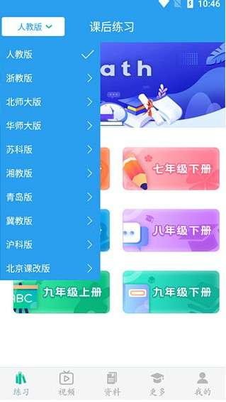软件提交 专题合集 热门手游初中数学助手app有哪些功能,首先用户需要在本网站下载安装好这款软件,在线选择自己学习的教材版本,人教版,浙教版,北师大版等等,选择好之后可以看到其中的内容与书上的信息是对应的,可以自由选择练习的章节。