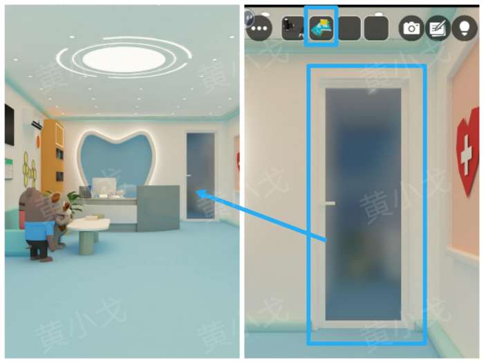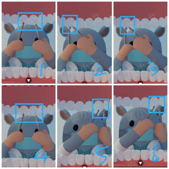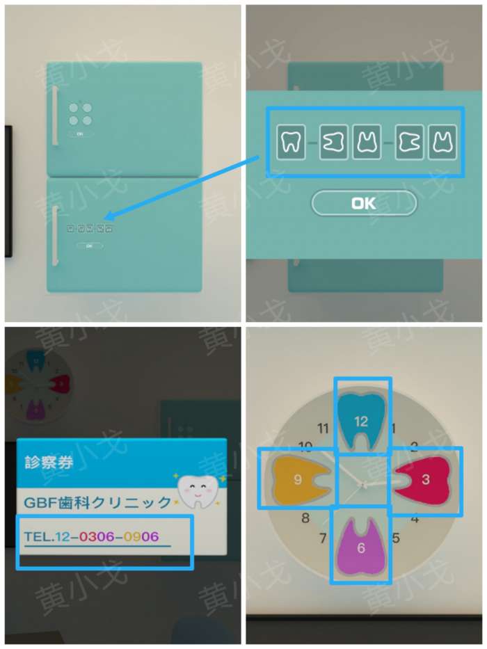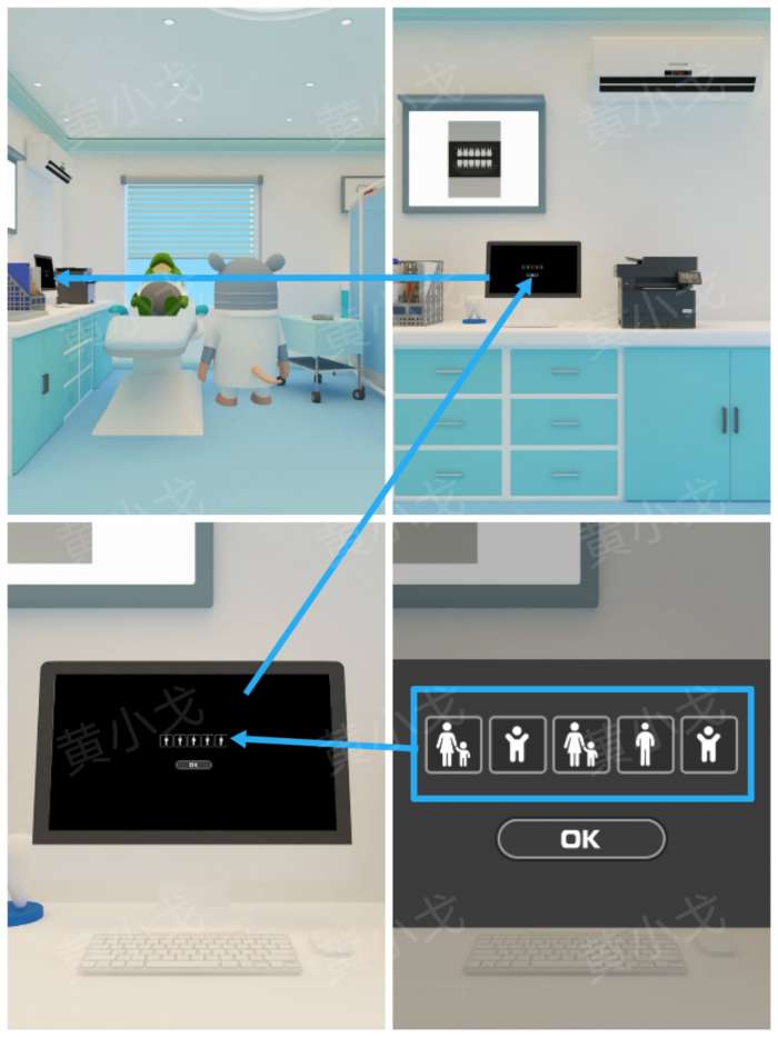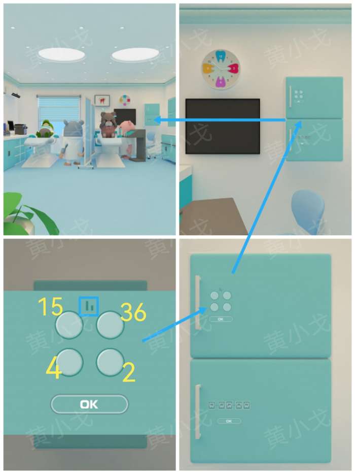 21.点击柜子左侧柜门上的密码锁,根据上面的牙齿图案提示,结合[治疗室右]医生检查牙齿顺序,按顺序按下按钮
