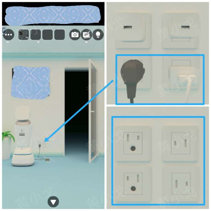 8.点击机器人旁边的插孔,把插头和充电器拔下来,获得线索