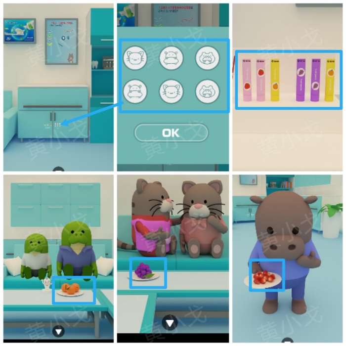 17.点击柜子右侧柜门上的密码锁,根据[治疗室左]牙膏线索,结合该场景三种水果对应的动物,调整密码锁