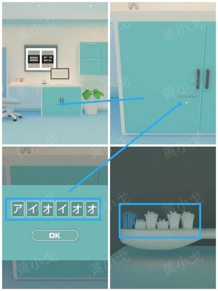 26.点击柜子上的密码锁,根据[大厅左]牙刷刷头线索和[治疗室右]猫猫提供的文字线索,输入密码