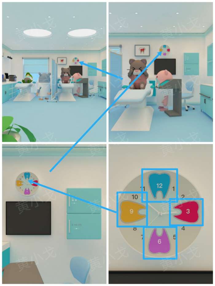 时钟上的线索(数字、牙齿朝向及颜色):12-蓝-上、3-红-右、6-紫-下、9-橙-左