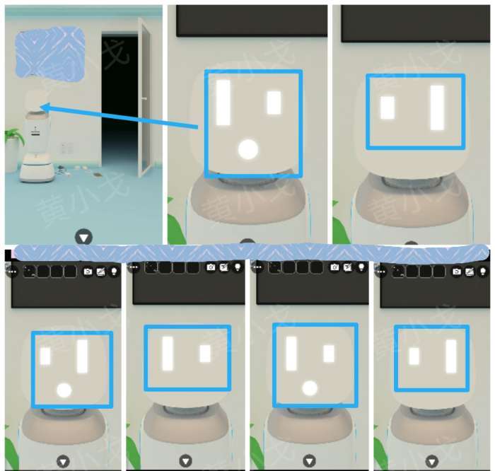 11.点击墙上的柜子,点击上层柜子上的密码锁,根据[治疗室左]场景插孔形状和机器人屏幕显示图案的顺序,按顺序点击按钮