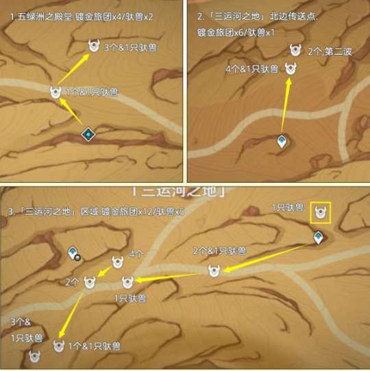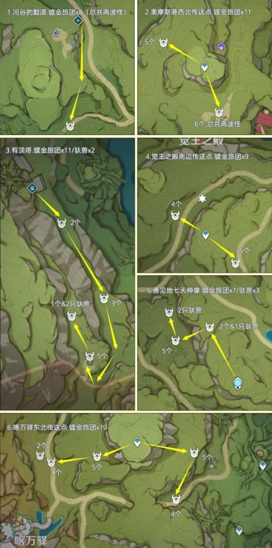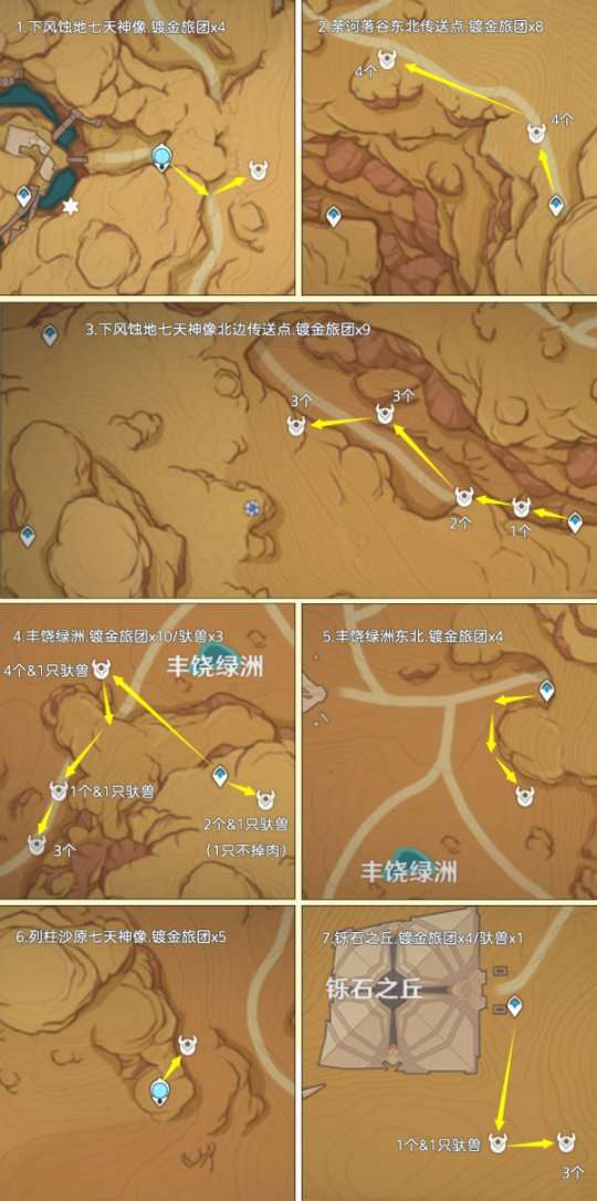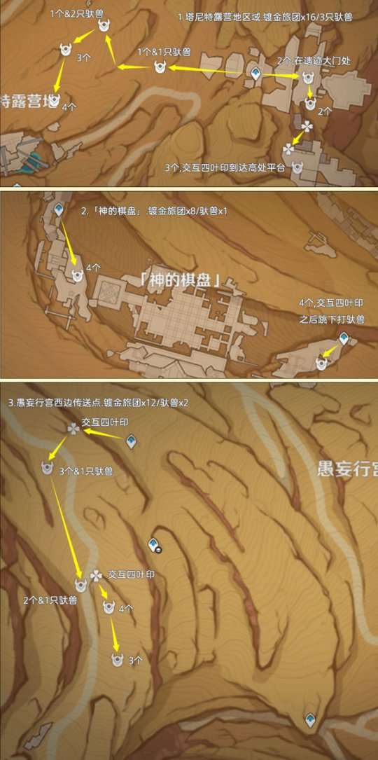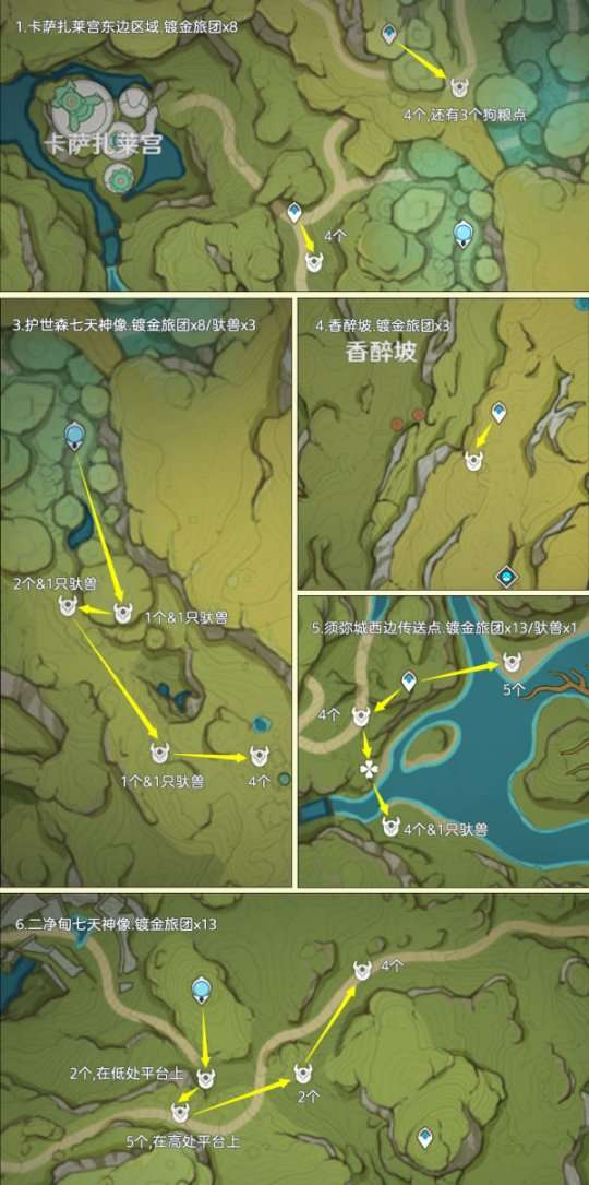 二、镀金旅团目前仅分布在须弥区域,共有212个地点(不包括27只驮兽和约100块兽肉)。其中,3.6版本的苍漠囿土没有高效率点位。关于标记,四叶印标记表示洞口、分支路线、传送门等,方便寻路。关于点位,可自行选择心仪的路线,选择权在你手中。