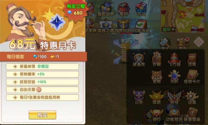 经过实测,游戏交易体系相当完备,设有拍卖行和面对面交易两种模式。不过想要开启自由交易 “大门”,需要开通68的玥咔。开通后不仅能解锁装备非绑、自由交易功能,还能享受爆率提升、每日钻石领取等超值福利,是搬砖党的 “入场券”。