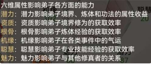 六维,因为是挑选战斗弟子,排除一些特殊情况,我们一般关注【潜力】、【根骨】、【资质】这三个词条,如图