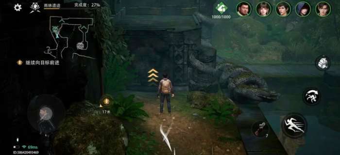 该任务位于西王母国雨林遗迹章节。进入地图后,需先传送至对应区域,随后沿主线引导抵达密林地带。此处存在多座由天然岩块堆砌而成的石桥结构。参考图示位置,建议优先编入吴邪作为主力操作角色——其专属解谜属性可显著提升交互响应效率;同时务必提前激活罗盘装置,该道具可使吴邪解谜成功率额外提升20%,是完成后续机关联动的基础保障。穿越浅水河道后,连续跃过两处山岩间隙,即可在右侧山体遮蔽下的水面上发现首个漂浮宝箱。