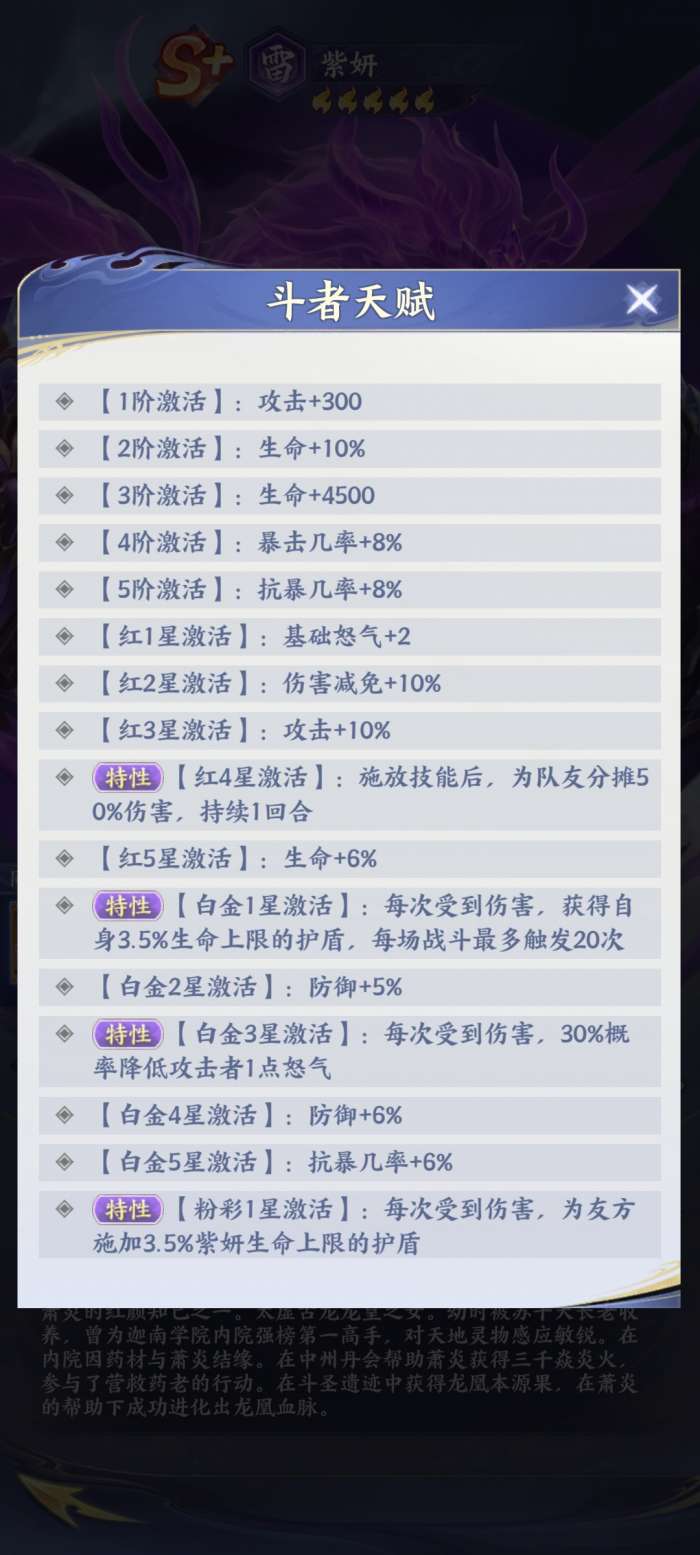 紫妍的战斗力主要集中在技能跟羁绊效果方面,比如在战斗的过程当中,他如果施展了普通攻击技能太虚龙爪。在这样的情况下就能够有效的打出单体爆发,而他的主动技能太虚拳,作为整个战术的核心。一旦施展之后,能够对敌人造成高额的单体伤害,还能够立刻获得自身的生命上限,如果能够持续两个回合的护盾,那么他其实能够有效地抗住敌人的攻击。