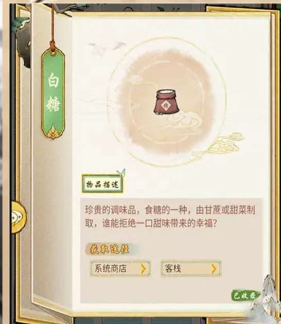 玩家们在第一次获取白糖后,就能在图鉴里去查看它的产出途径。当前游戏里只有两种方法去获得它,其一就是从系统商店里购买。要知道,市集会将游戏内所有酒楼的物品都统一为玩家们进行收录,方便玩家们去购买,无需玩家亲自跑过去。在使用时,大伙只需打开商城,并选择市集,再将上方的选项切换成食材,就能看到醉仙居专属特产白糖了。不过,玩家购买时要注意白糖的价格是需要用铜钱支付还是银子支付,且只建议在白糖的单价为200铜钱时才去购买。如果玩家查看时白糖的价格刚好需要用银子来支付,可选择使用第二种方式来获取白糖。