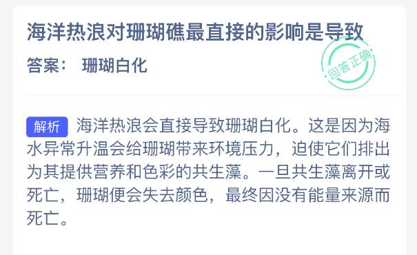 以上就是海洋热浪对珊瑚礁最直接的影响是导致?蚂蚁森林神奇海洋今日答案2025年12月18日分享,更多相关攻略内容,请点击关注pk游戏网更新!