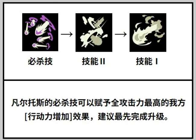 那么在副能力效果上面,大家要看的就是凡尔托斯的暴击抗性以及整体的防御力数值还有体力百分比,一般情况下这类能力带来的整体效果是为他带来攻击以及防御属性上面的能力,所以,作为前排的话,除了他基础的防御数值之外,后期能够提升防御的话还是要往这方面来进行培养,如果想要将他的强势度更早放出来,那么这里在升级顺序上面大家就要注意,他的必杀技一定是要优先升级的,其次是技能2,最后才是技能3,按照这样的一个顺序,可以让凡尔托斯的整体能力提升的速度更快一些,因为法尔特斯目前他的必杀技的效果上面,可以给全体攻击力最高的我方角色带来行动力增加的能力,根据这样的能力带来的升级效果也会更强势一些。