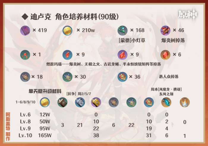 ② 迪卢克需要3个技能全部升级,圣遗物套装优先魔女4件。