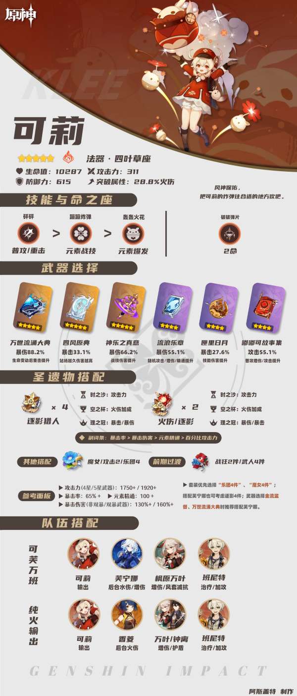 ③通常情况下,可莉的主词条优先是攻击沙漏、火伤杯、暴击/暴伤头冠,暴击率推荐在65%+(能尽可能地堆叠至75-80%是一个比较舒适的区间)。