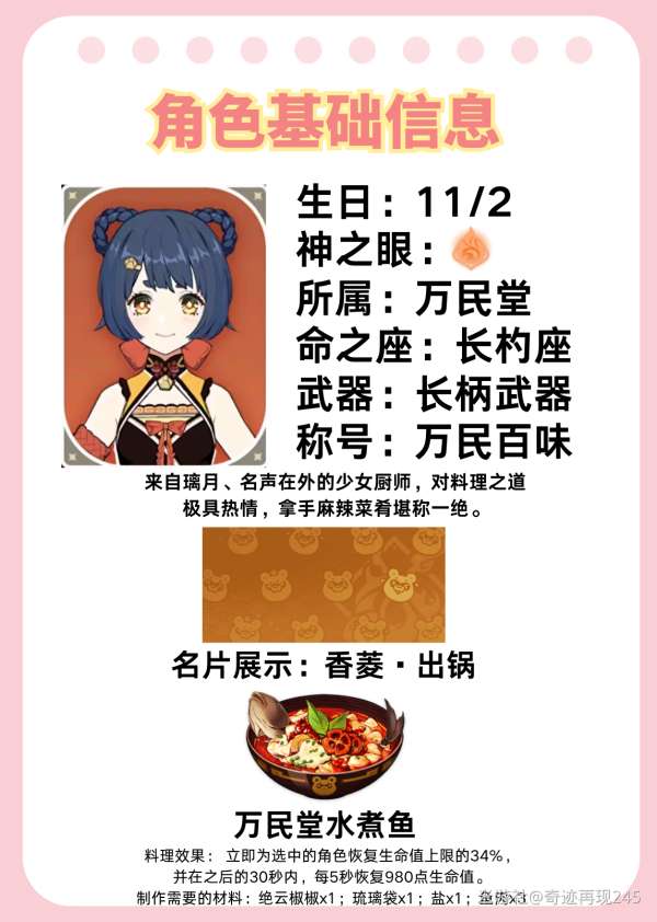 ①香菱的特色料理食谱可以找卯师傅(璃月「万民堂」的老板)获取。
