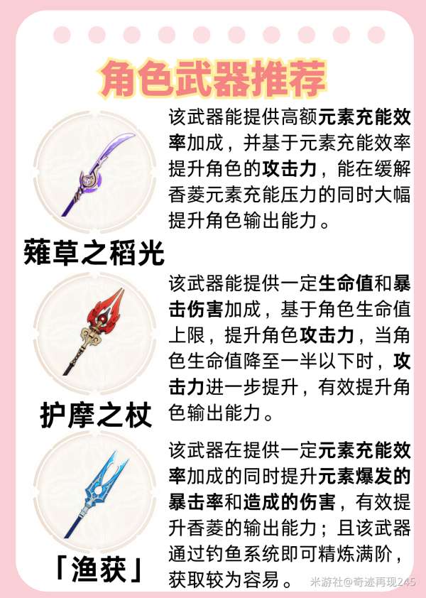 ③武器选择方面,香菱首选的武器是薙草之稻光。这个武器可以提供高额元素充能效率加成,并且能够根据元素充能效率提升角色的攻击力。与绝缘之旗印圣遗物套装搭配效果更佳。除此之外,还可以考虑护摩之杖,这个武器能够直接提升角色的生命值和暴击伤害,并且基于生命值进一步提升攻击力,有效提升角色的输出能力。如果需要驻场输出,则可以选择五星武器和璞鸢。在四星武器方面,最优解是使用通过钓鱼获得的武器「渔获」。这个武器不仅可以提高元素充能效率,还可以提高元素爆发的暴击率和造成的伤害,有效地提升角色的输出能力。除此之外,还可以考虑使用决斗之枪、匣里灭尘等四星武器直接提升伤害输出能力。