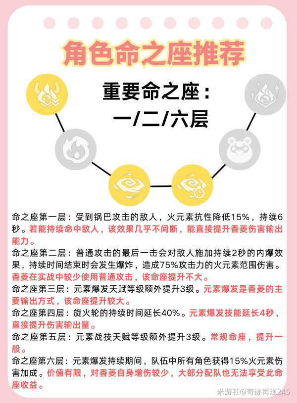 命之座第一层:受到锅巴攻击的敌人,火元素抗性降低15%,持续6秒。若能持续命中敌人,该效果几乎不间断,能直接提升香菱伤害输出能力。