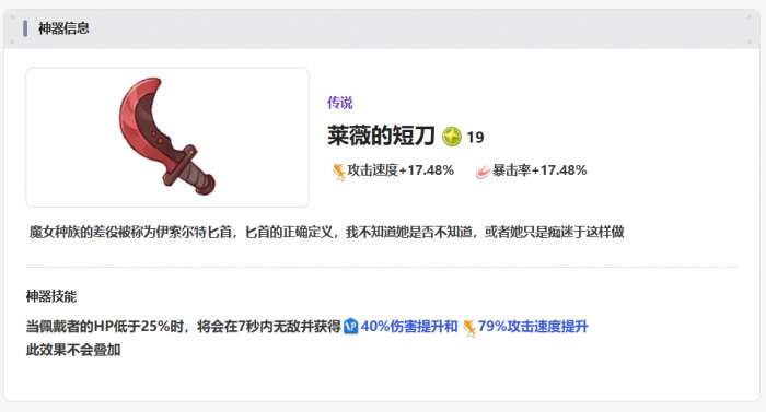 第三个神器为大家推荐叫做莱薇的短刀,这个神器在攻速有一定提升之后,还可以给角色的暴击属性都带来一定的数值加成,在效果上面,大家可以根据目前血量的数值来操作,因为只要是在血量状态低于25%的时候,这个神器就会给大家增添无敌的效果,无敌状态会一共持续几秒时间,在这个无敌状态之内,角色的伤害会有40%的提升,并且在攻速上面达到最高的提升效果会达到79%的数值,这个数值比很多的角色在技能的提升数值上面要高了。
