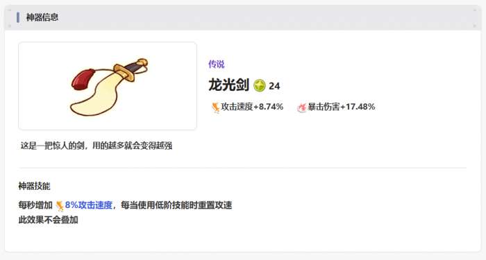第一个为大家推荐的神器叫做龙光剑,龙光剑是一个可以给攻击类角色使用的神器,这个神器在属性方面带来的提升,是体现在攻速和暴击加成上面的,在效果上,它可以在攻击敌人之后提升自己的攻速,不过这个攻速是按照生效的秒数里面才可以提升的,最多带来的攻速提升数值达到了8%的数值。