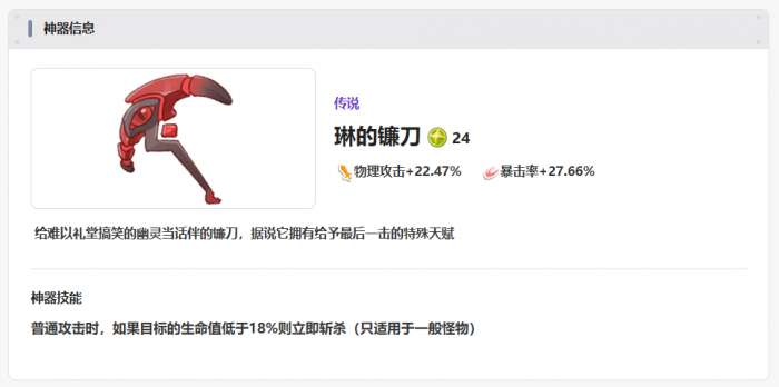 第9个神器为大家推荐的是琳的镰刀,这个神器是给物理系角色使用会比较好,因为带来的物理攻击力提升效果比较强,而在暴击率加成上面,也是比较适合物理流派使用的,而在使用这个神器拥有的普攻攻击,也是会带有一定额外的效果,这一点体现在斩杀的能力上面,如果敌方有18%的血量的话,那么此时使用斩杀这个概率触发会比较大。