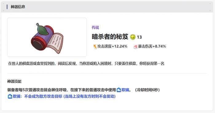 第2个神器叫做暗杀者的秘籍,这个神器目前也是带有一定攻速提升效果的,但是另外的效果上面是在暴击伤害属性当中,装备之后带有一定的加成效果,所以拥有的装备在攻击的时候,次数只要达到5次的话,那么此时就会给到一次欺骗的效果施加给敌人,欺骗的这个效果的用处还是比较多的。