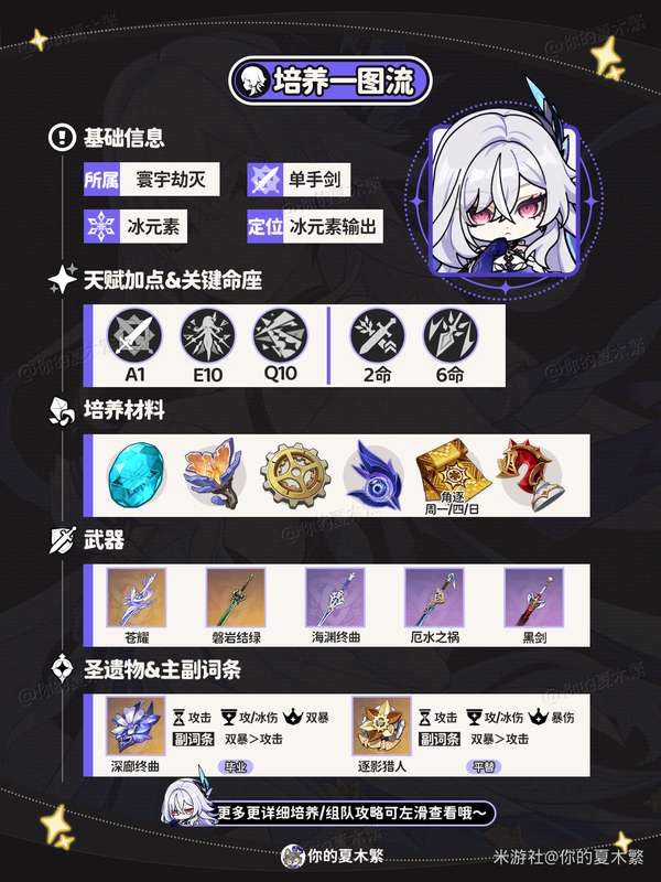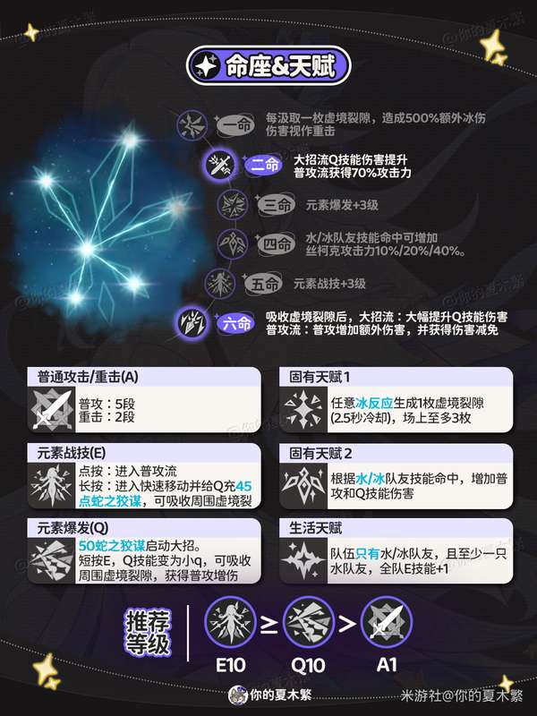 丝柯克(Skirk),0命机制完整,锁水冰元素,有普攻流和大招流两种输出方式,两者的技能倍率都较高,输出手法也非常简单(5A连招和长EQ)。