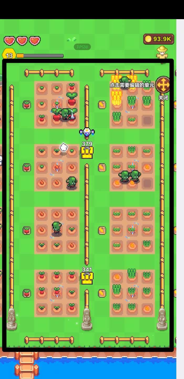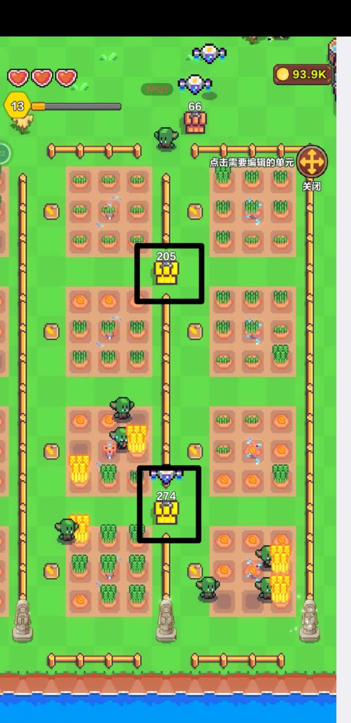 5、每块农田中间放置一个浇水器,浇水器买的时不能直接放在田块中间,会显示红色,先随便放在一边,购买完在挪到田块中间就可以放置。