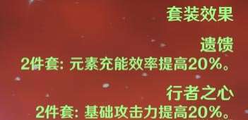 行者之心两件套可提升班尼特的基础攻击力和伤害,并且美妙旅程技能带来的攻击加成是和班尼特自身基础攻击力挂钩的,因此使用其效果会更好。