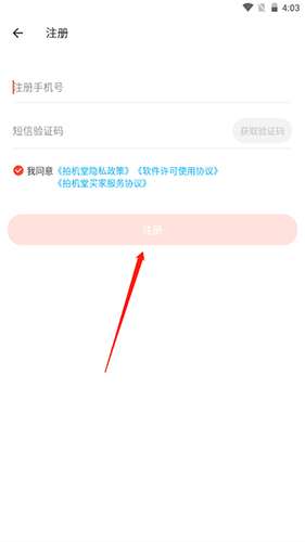 3、输入手机号和验证码后点击注册按钮即可。