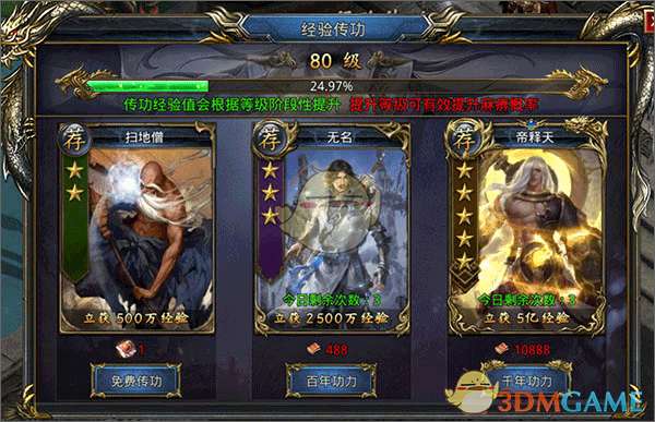 1、进入游戏后,跟着主线走,少侠可快速升到65级,并且完成至尊神兵-英雄剑任务秒得至尊神兵!获得神兵经验池,每次击杀怪物可以增加神兵经验池的经验,使用神兵精魄可以立刻提取神兵经验池的经验快速升级,立刻享有百倍经验加成特权,急速成长!(免费开放随身回收,解放背包无需回城回收,方便挂机)