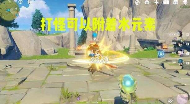 因为身边有隐形水小剑的加持,靠近怪物还可以给怪物上潮湿,让我们不用再切换人物就可上状态。如果你队伍有一个火系角色,那么轻松一个人可以打出蒸发了,再也不用切换角色上状态,而且这个水元素附着是一直都存在的,只要你靠近怪就会生效。