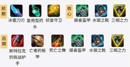 3.后期装备:斯特拉克的挑战护手+亡者的板甲+死亡之舞+振奋盔甲+水银之靴+三相之力(神话)