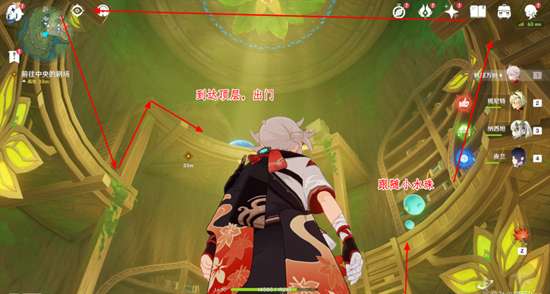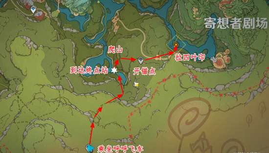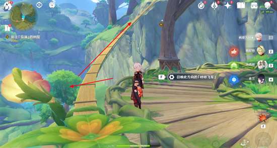 2、按照图示路线走,乘坐呼呼飞车来到拉四叶印到对面平台处,绕上去触发对话。