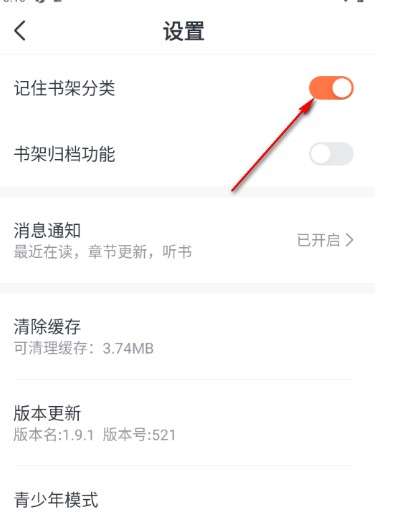 3.这时候我们就可以在打开的页面上,选择【记住书架分类】功能选项,将其开关按钮点击开启即可。
