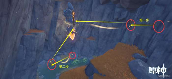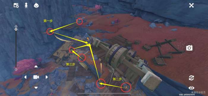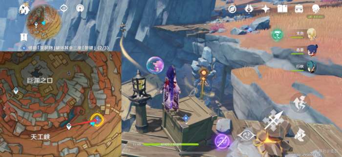 击碎岩种子,让其归位至笼状「岩元素」聚合物,然后对准磐键攻击,让磐键下落,三步完成破坏,下面房屋处有盗宝团