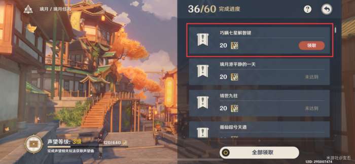 完成巧瞒七星解磐键任务后,旅行者可以前往「璃月总务司」干事·小雨处,获得声望值+20