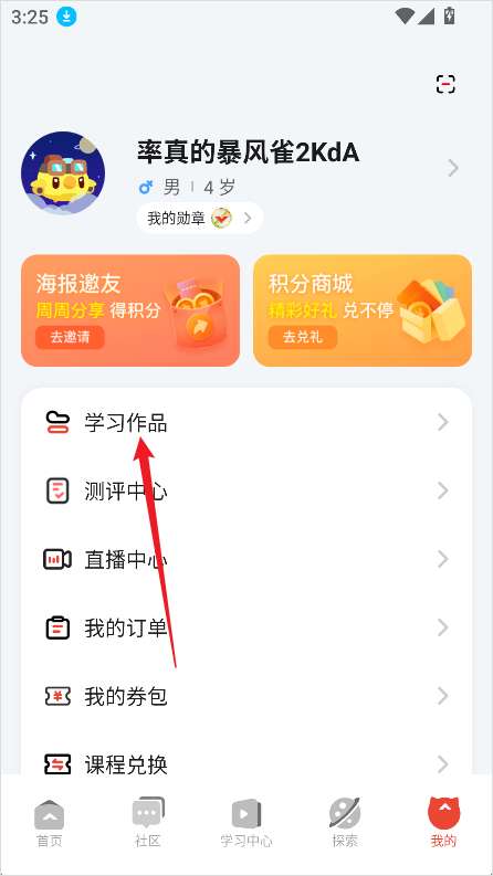 2、在个人中心中选择【学习作品】。