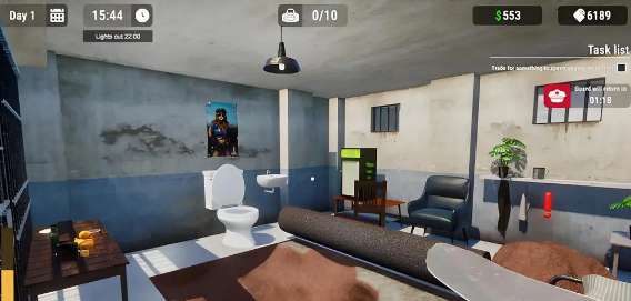 越狱模拟器以监狱逃脱为核心,玩家需在14天内策划越狱,游戏采用3D场景和昼夜系统,白天执行日常任务降低警戒值,夜晚秘密行动。主要流程包括: