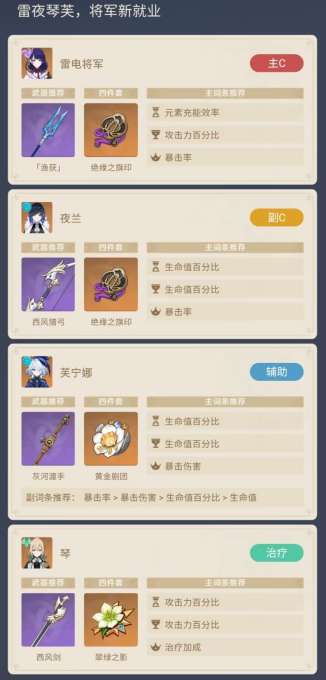 雷神给夜兰芙宁娜充能,琴则提供减抗和治疗,夜兰和芙提供后台输出和增伤,雷神站场